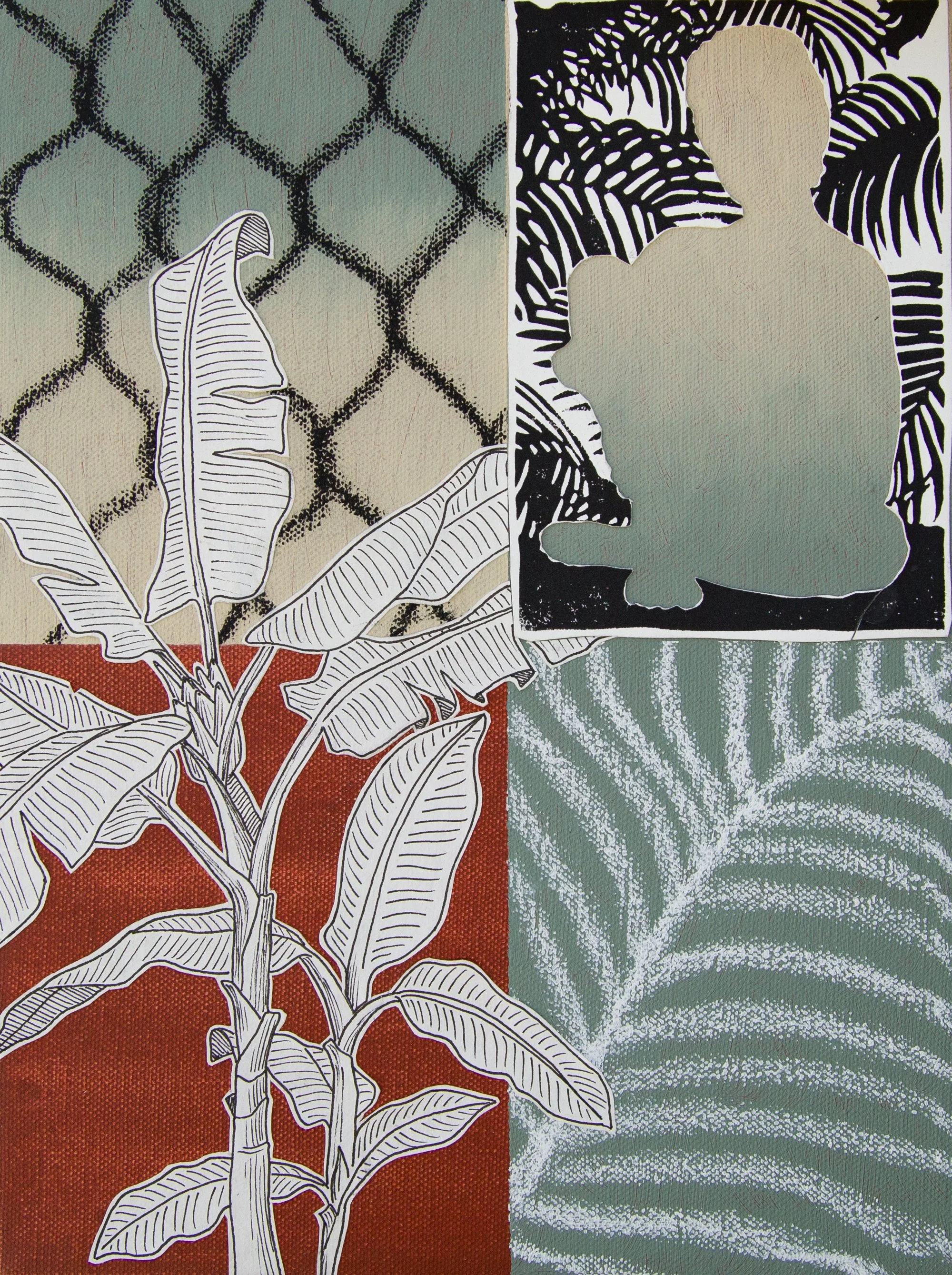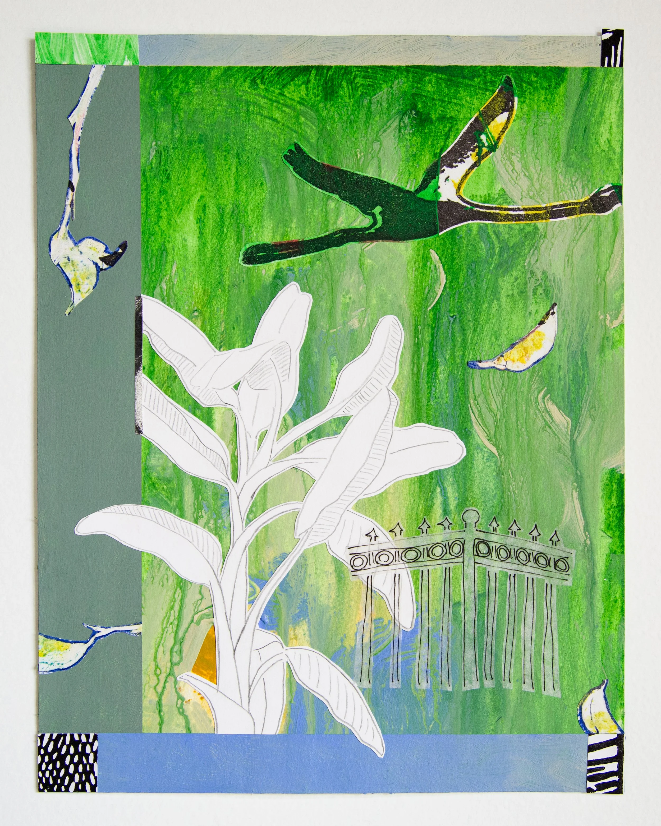 Behind The Gate, 2024 13" x 10" Acrylic, Graphite, Ink, and Collage on Arches BFK Paper